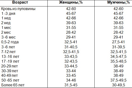 Нормальные показатели гематокрита в зависимости от возраста приведены в таблице:
