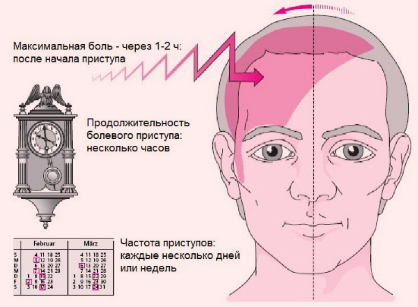 Пульсирующие боли создают впечатление, что боль исходит изнутри, как будто что-то давит на кости с невероятной силой. Усиление болей происходит тогда, когда человек начинает двигаться, менять свое положение тела, физически нагружать его. Чаще всего боли усиливаться до наступления тошноты, а позднее и рвоты. После рвоты становиться немного легче. Длительность приступов может составлять как несколько часов, так и несколько суток.