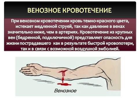 Венозное кровотечение отличается от артериального и капиллярного характерным темно-вишневым цветом.