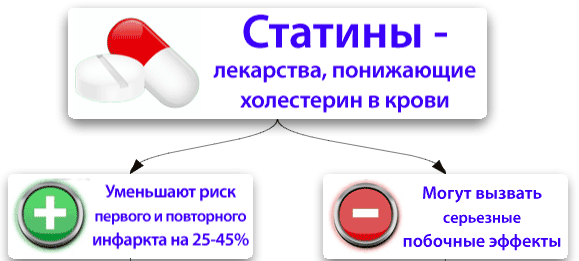 Таким образом, статины это препараты, применяющиеся для снижения холестерина. Большая часть из них обладает широким спектром побочных эффектов и противопоказаний. В то же время, статины способны эффективно снижать концентрацию «плохого» холестерина, существенно снижая вероятность инфаркта и инсульта.