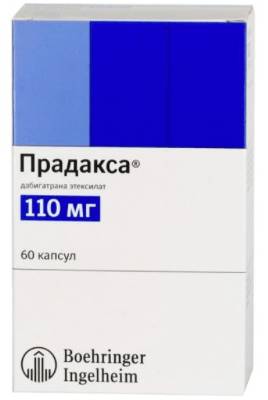 Прадакса. Является антикоагулянтом, ингибитором тромбина. Угнетает активность тромбина, тем самым предотвращает образование кровяных сгустков. Выпускается в капсулах для внутреннего применения. Противопоказан при аллергии, патологиях печени и почек, кровотечении, наличии искусственного клапана в сердце. Стоимость 1800-3698 руб.