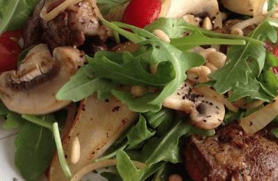 - салат с рукколой и куриной печенью с яблоком и грушей, заправленный зернами граната и лимонным соком;