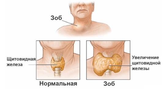 Единственный специфический симптом — зоб. Зоб – это стойкое увеличение щитовидной железы, которое заметно невооруженным глазом. При злокачественном новообразовании и аутоиммунном тиреоидите зоб может быть небольшим, плотным и болезненным при пальпации, при гипертиреозе зоб иногда вырастает до огромных размеров.