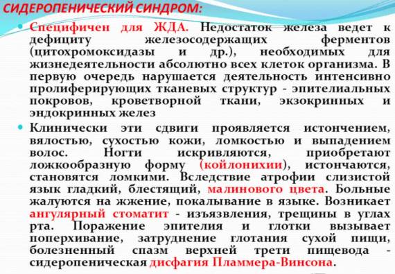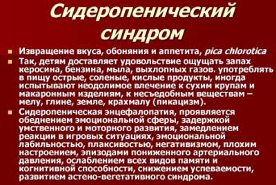 Сидеропенический синдром характеризуется дефицитом железа в организме, что приводит к анемии, снижению уровня гемоглобина и нарушению кислородного обмена. Основные симптомы включают усталость, слабость, бледность кожи, головокружение и ломкость ногтей. Часто наблюдаются изменения в пищевых предпочтениях, такие как желание есть неестественные вещества (пикацизм).