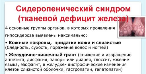 Сидеропенический синдром обусловливается недостатком железа, что чревато уменьшением активности многих жизненно важных ферментов. Синдром возникает по причине нехватки железа в крови и, соответственно, уменьшением уровня гемоглобина. Сам дефицит развивается по причине сбоя в его поступлении извне.