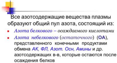 Под остаточным азотом понимают азотсодержащие элементы, оставшиеся в крови после отфильтровывания белков. Используя значение суммарного показателя и отдельных показателей можно диагностировать возможные патологии. Остаточный азот состоит из 15 соединений, представляющих продукты обмена белков и нуклеиновых кислот, особенно важны следующие показатели: