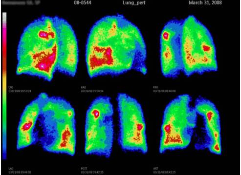 Этот метод диагностирования информативен и в 90% случаев помогает выявить тромб в лёгких. С помощью него врач увидит, в какие участки органа не поступает кровь. Его часто используют, когда пациенту в силу каких-то причин нельзя делать компьютерную томографию.