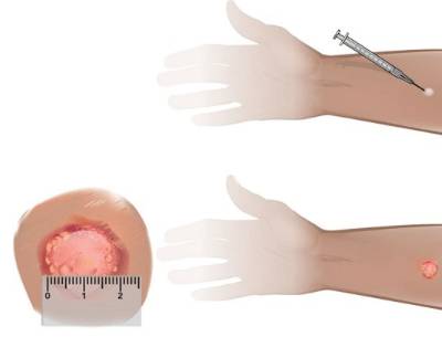 Диаскин-тест также проводится специально обученным работником, вводят 0,1 мл туберкулиновым шприцом подкожно, также как в методике Манту.