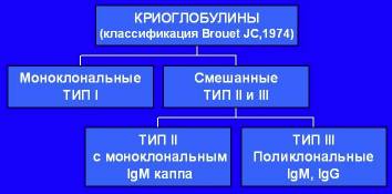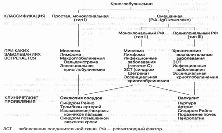 По этиологии выделяют первичную (эссенциальная, идиопатическая) и вторичную (ассоциированную с заболеваниями). В зависимости от типа белков, различают следующие типы криоглобулинемий:
