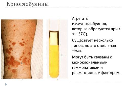 Они представляют собой иммуноглобулины, способные активнее соединяться с эритроцитарными антигенами при температуре менее 37 градусов. А криоглобулины, как вы поняли, это иммуноглобулины, которые при такой температуре преципитируют (падают).