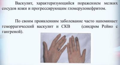 Поражение кожи характеризуется геморрагической сыпью, на голенях и бедрах, сопровождается крапивницей.