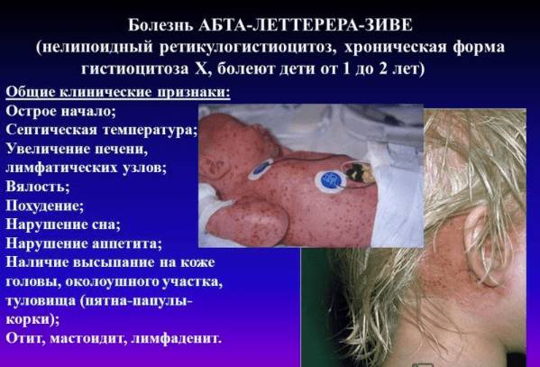 - Болезнь Леттерера-Сиве – является злокачественной формой заболевания. Встречается редко, обладает высоким процентом летальных исходов. Развитие обычно происходит у детей в возрасте до 3 лет. Проявляется поражением не только лимфатических узлов, костей и внутренних органов, но и кожного покрова – могут появляться различные высыпания и шелушащиеся участки, переходящие в язвы;