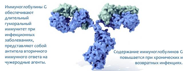 Иммуноглобулины являются белковыми соединениями крови человека. Выработка антител IgG помогает организму сопротивляться инфекциям. Поскольку иммуноглобулин обладает маленькой молекулярной массой, он легко проникает к ребенку через плаценту. Это помогает создать иммунитет эмбриона, способный защитить его до 9 месяцев жизни. Затем организм самостоятельно вырабатывает иммуноглобулины класса G.