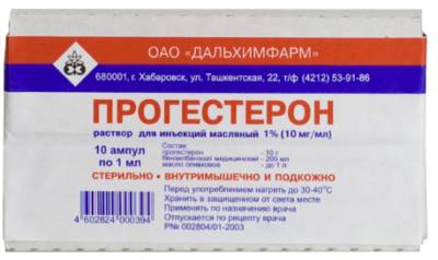 Прогестерон 1%. В 1 мл содержится 10 или 25 мг вещества. Ампулу необходимо нагреть до температуры тела, вводить внутримышечно. Дозировка определяется тяжестью и течением заболевания – 5-25 мг в сутки. При угрозе выкидыша гормон назначают до 4 месяца беременности.