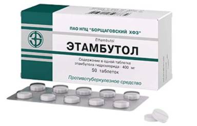 Этамбутол (средняя цена 230 руб.) — основное вещество препарата проникает в активно растущие клетки микобактерий, чтобы ингибировать процесс синтеза РНК. Противопоказания: