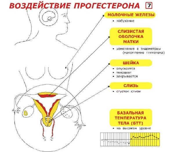 Высокий уровень прогестерона способствует выработке защитной слизи, которая препятствует попаданию в матку болезнетворных микробов. При появлении в полости матки плодного яйца прогестерон помогает его имплантации и укреплению в толще эндометрия матки.