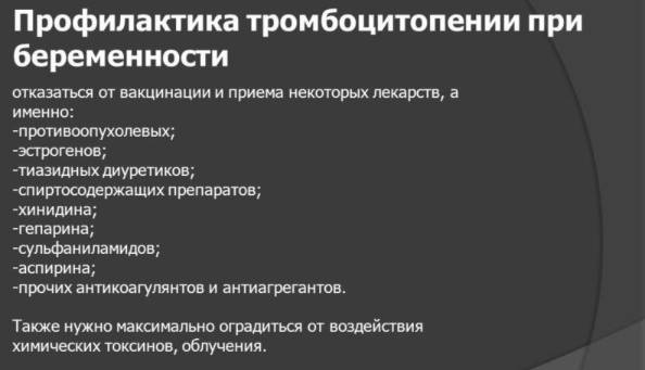 Беременные должны избегать воздействия токсинов и облучения, принимать лекарственные средства и биологические добавки только по согласованию с врачом. Если у родственников были случаи заболеваний дефицита тромбоцитов или свертываемости крови, необходимо на ранних сроках беременности проконсультироваться с гематологом.
