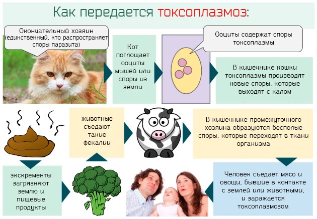 Возбудитель заболевания живет в организме животных и птиц. Медики выделили 360 разновидностей животных, которые являются переносчиками токсоплазмы. Однако размножаться возбудитель может только в кишечнике кошки. После размножения, из организма с испражнениями кота личинки выходят во внешнюю среду и капсулируются. Во внешней среде они устойчивы и могут длительное время сохранять опасность. Человек заражается оральным путем при поедании цисты токсоплазмы. Рассмотрим распространённые причины заражения: