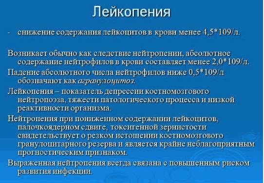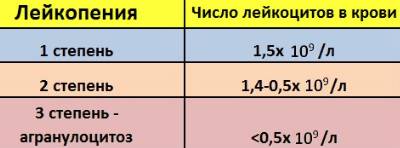 Легкой степени – лейкоциты 4, 0–2, 0×10⁹/л. Средней степени – лейкоциты 1, 9–1, 1×10⁹/л. Тяжелой степени – лейкоциты менее 1, 0×10⁹/л, нейтрофилы менее 0, 5×10⁹/л.