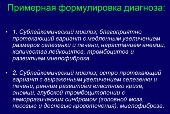 В заключение можно сказать, что сублейкемический миелоз считается серьезным онкологическим заболеванием, имеющим различные по степени тяжести проявления и требующим тщательного выбора схемы терапии в зависимости от фазы развития болезни.