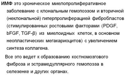 Проявляется повышенной степенью полиморфно-клеточной миелопролиферации, которая протекает по типу миеломегакариоцитарного панмиелоза/миелоза, и сопровождается миелофиброзом, прогрессирующим течением остеомиелосклероза и увеличением печени/селезенки с 3-ростковой миелоидной метаплазией в перечисленных и, что встречается намного реже, в других органах.