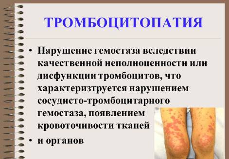Тромбоцитопатия — это категория наследственных болезней, при которых количество тромбоцитов остаётся нормальным, но в них фиксируются изменения, нарушающие гемостаз. У пациента появляются синяки и кровотечения при незначительных механических воздействиях, могут быть кровопотери, возникает анемия. Диагностировать это состояние позволяет исследование гемостаза, взятых на анализ пункций, биологического материала костного мозга. Терапия назначается гематологом.