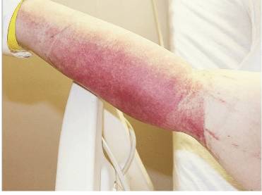- Проба жгута. В область плеча человеку накладывают жгут на 5 минут. При болезни в этом месте появляется гематома. Проба жгута показана на фото.